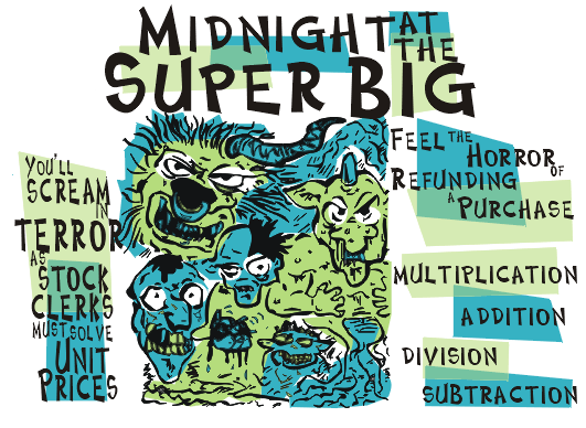 It is late night at the Super Big food store. The small staff is about to be assaulted by rude and uncaring customers. You must use your math skills to help them make it till morning!